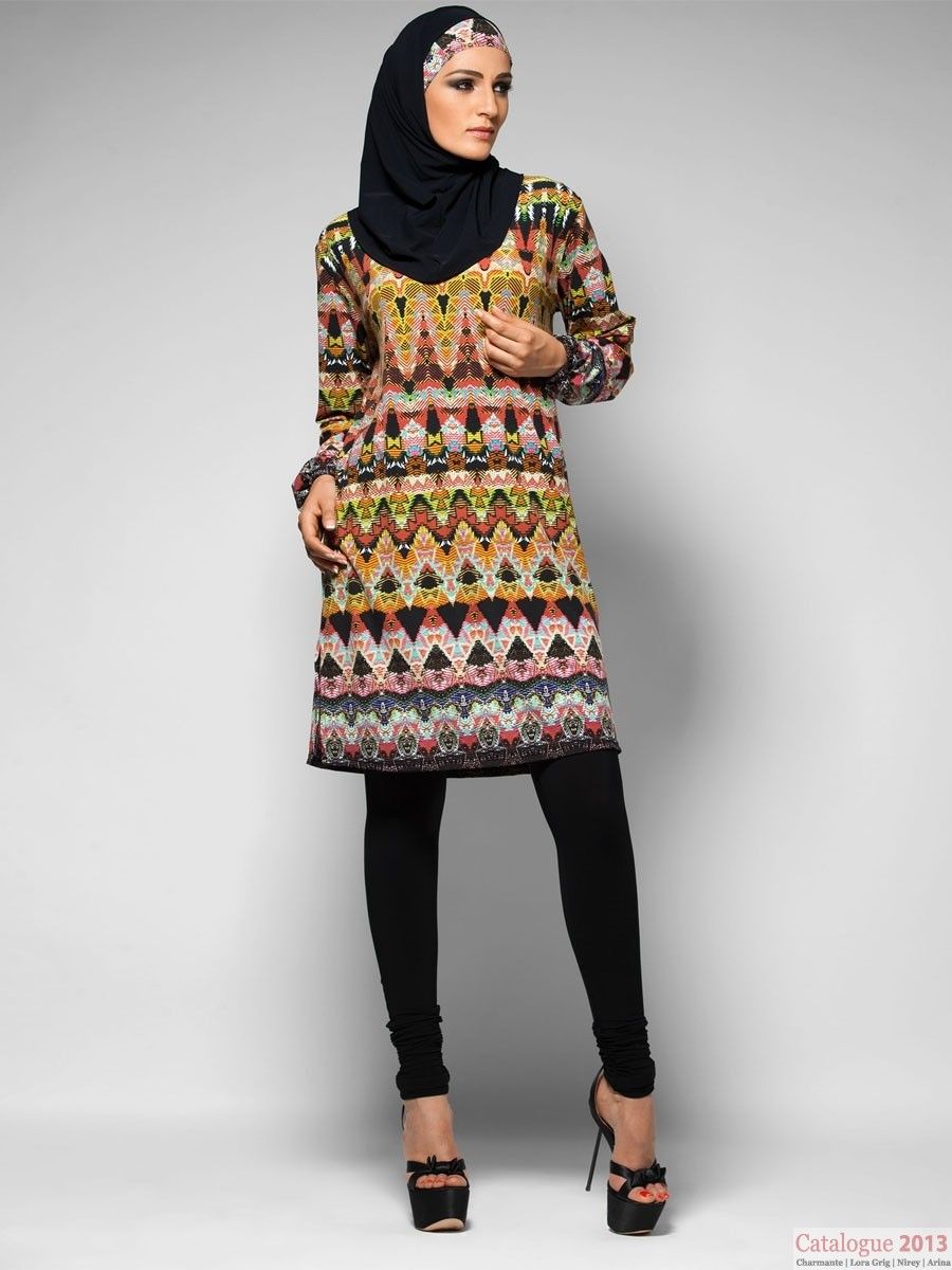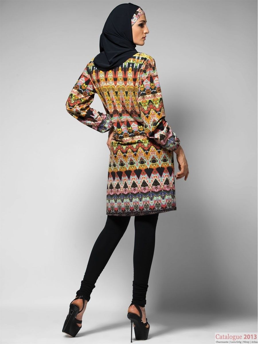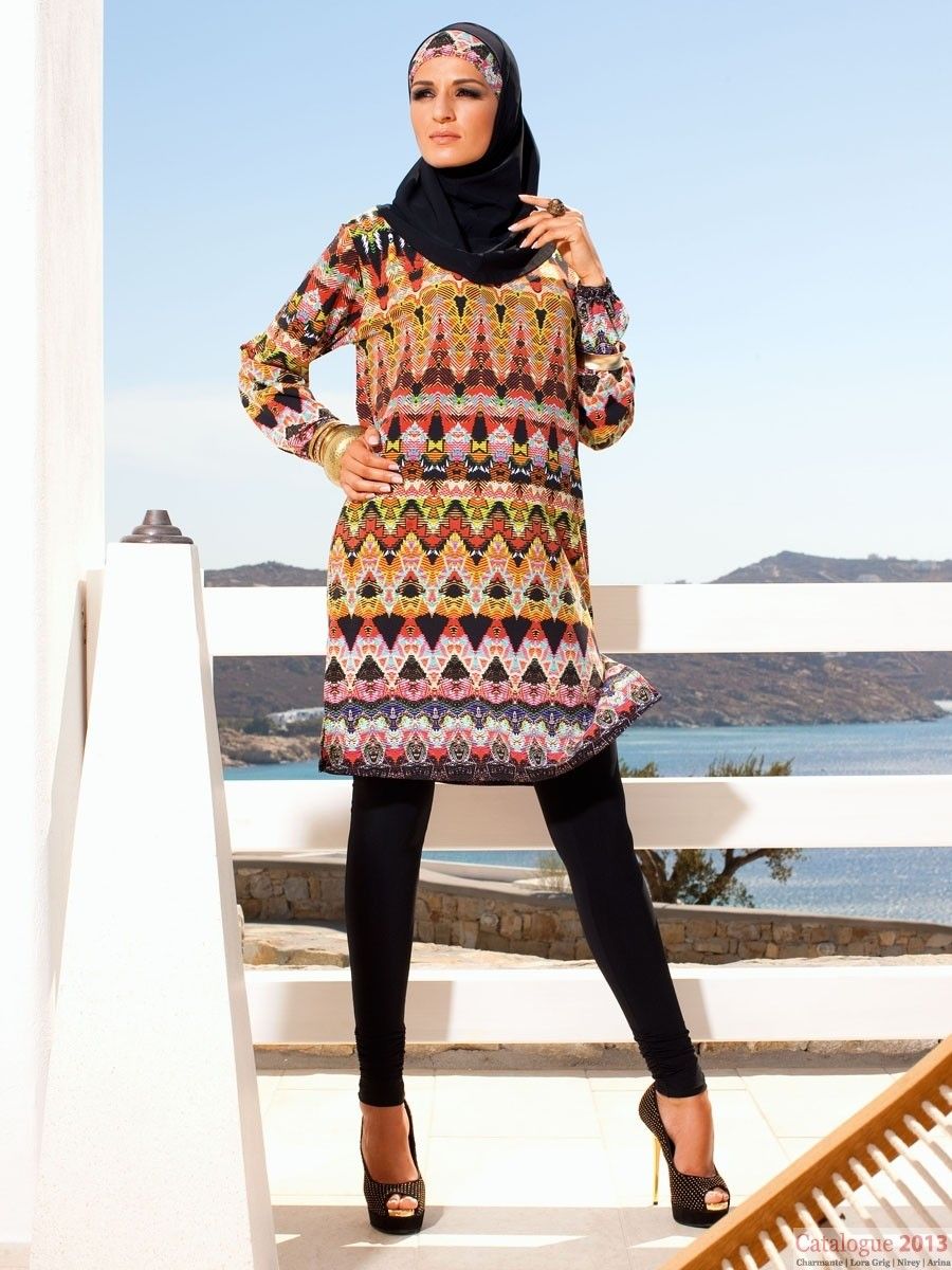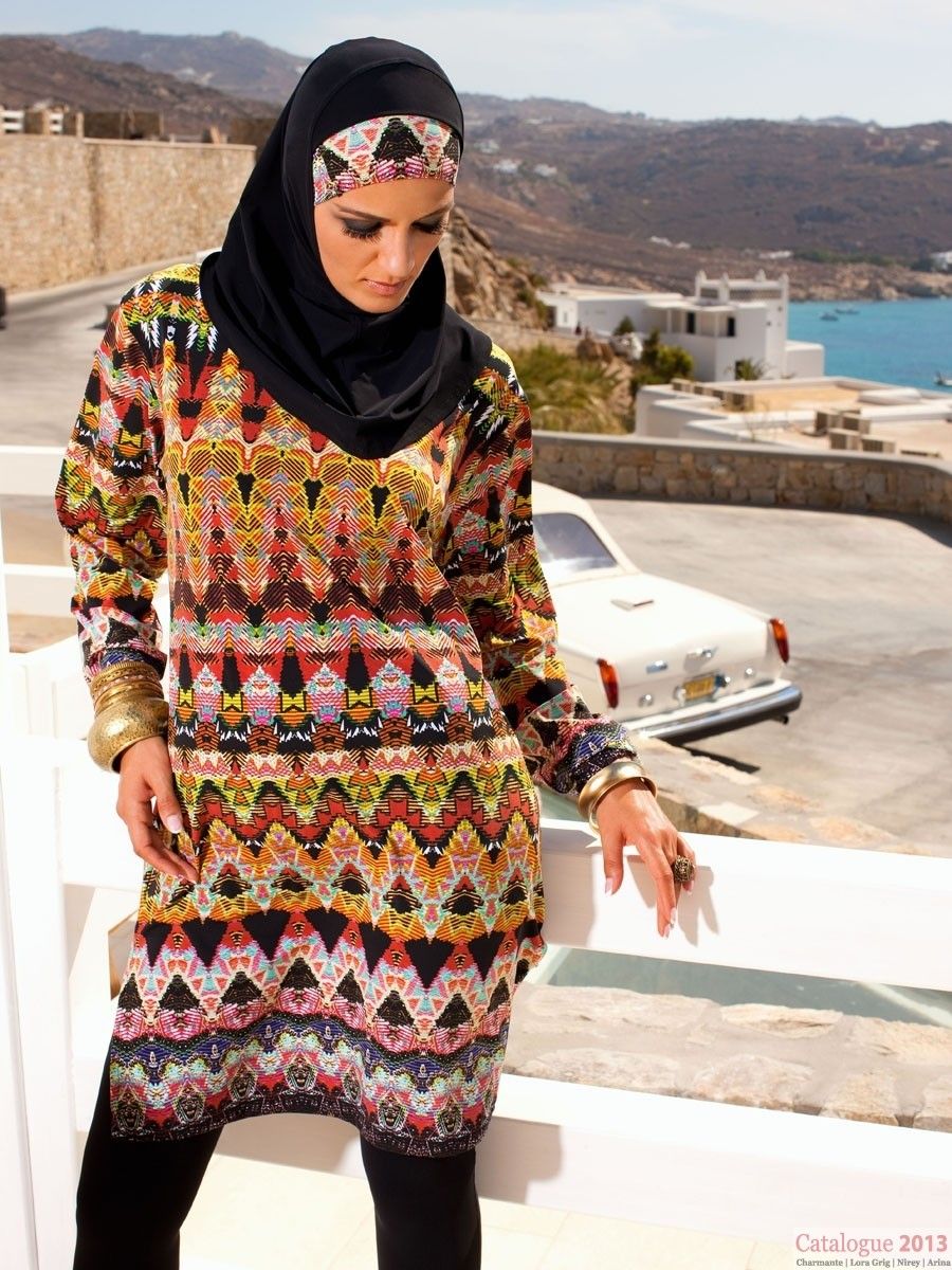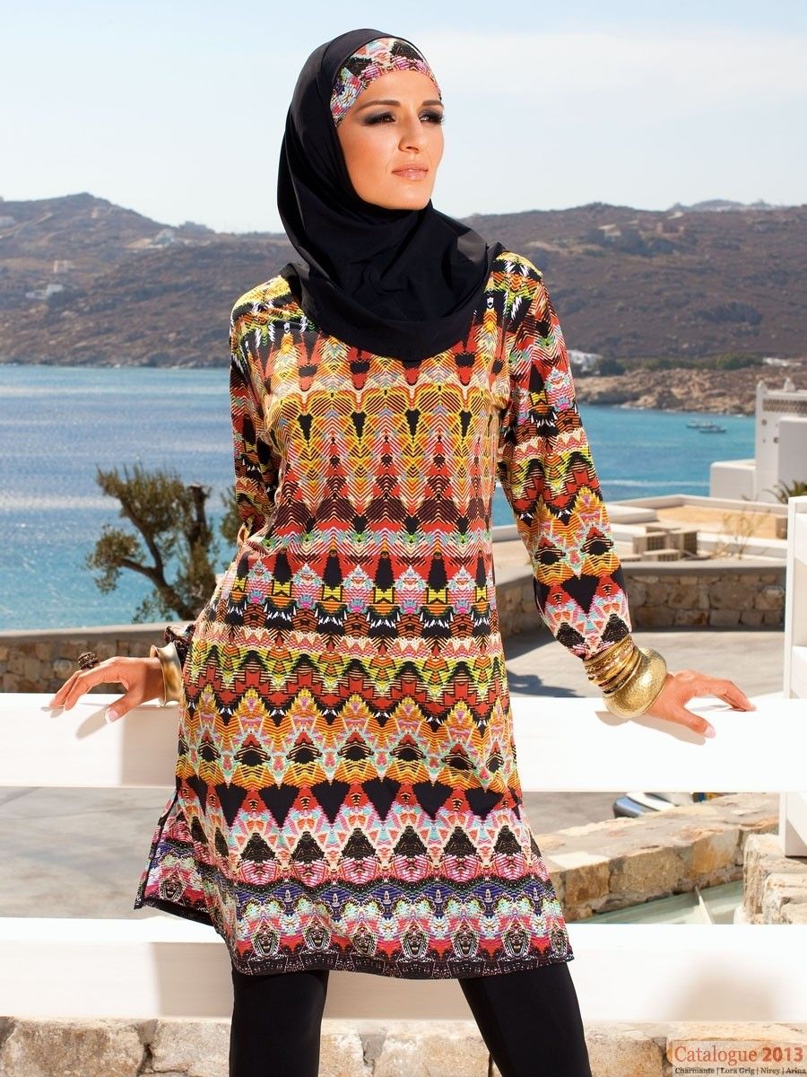 Молодежный купальный костюм – буркини, который состоит из купальника, брюк, туники, шапочки и капора. Раздельный купальник телесного цвета украшен вензельным логотипом по задней детали. Узкие черные брюки на эластичном поясе зафиксированы к низу манжетами. Туника с разрезами по бокам из принтованной ткани с длинными рукавами и манжетами. Костюм из быстросохнущей купальной ткани дополнен внутренней принтованной шапочкой, бони, и черным капором для комфортной носки на пляже и в бассейне для женщин, исповедующих ислам. Купальники 2013 Lora Grig Burkini