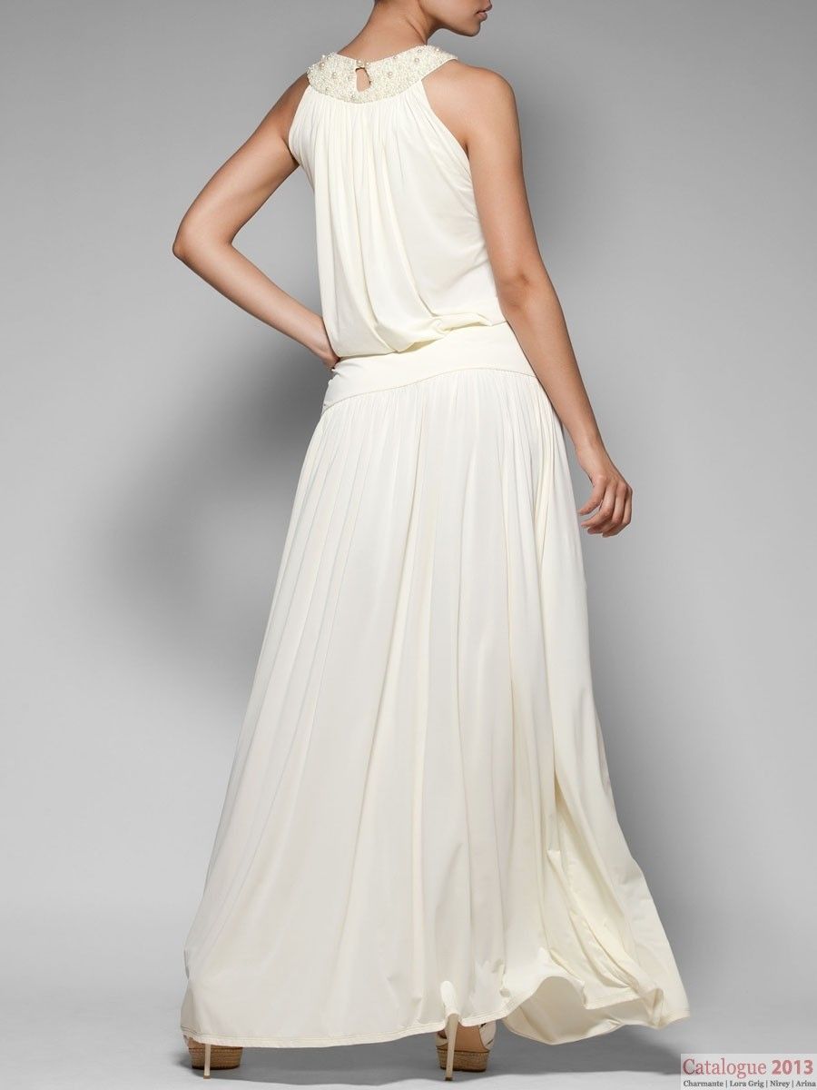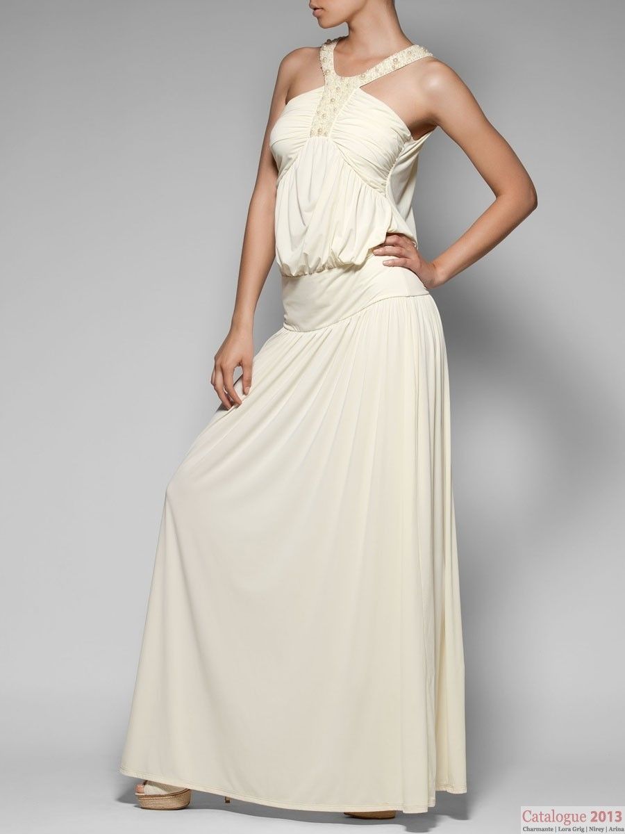 New style! Изящное длинное платье для свадебной церемонии на пляже. Эффектная драпировка на груди переходит в ошейник, расшитый жемчужными бусинами. Широкий эластичный пояс на бедрах подчеркивает женственность силуэта. H1 S/M, L/XL