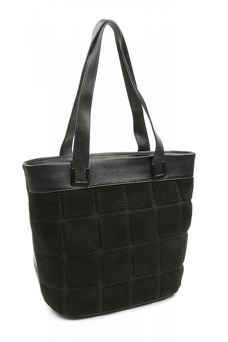 Женская сумка из натуральной кожи и замши черного цвета. Внутри два отдела, разделены средником на молнии, с одной стороны скрытый карман на молнии, с другой два открытых кармана для сотового телефона и мелочи.