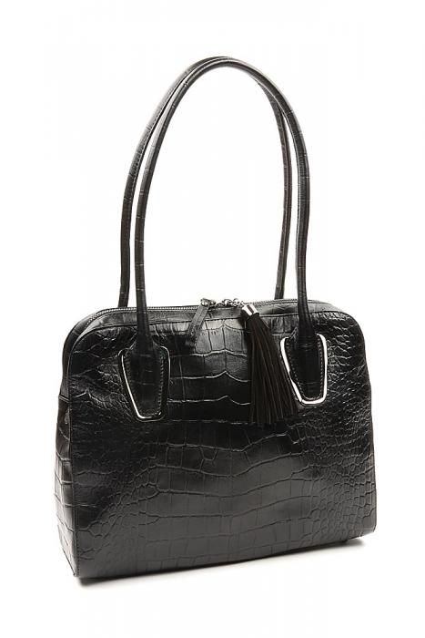 Женская сумка из натуральной кожи черного цвета. Внутри два отдела, разделены средником на молнии, с одной стороны скрытый карман на молнии, с другой два открытых кармана для сотового телефона и мелочи.
