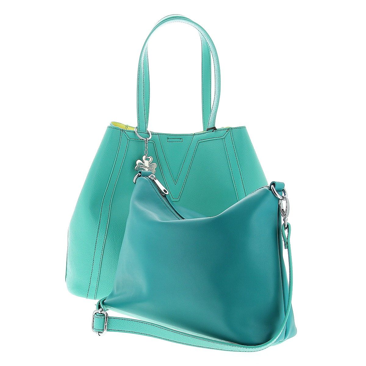 Женская сумочка DISPACCI бирюзового цвета. На сезон весна-лето 2014 очень популярны будут сумочки в форме трапеции и минимализм в отделке. Сама сумочка выполнена из мягкой высококачественной эко кожи, за счет креплений у основания сумки, может менять форму. Дизайнеры не перестают удивлять нас своими новыми идеями! Две сумки в одной! Прекрасный вариант для тех кто любит удобство и стиль. Внутри сумки еще одна сумка золотого цвета, которая застегивается на общую металлическую молнию, и имеет боковой карман на молнии, и кармашки для мобильного телефона и мелочей, также к ней прилагается наплечный ремень, максимальная длина 110 см. Цвет фурнитуры - серебро. Модель имеет две ручки, высота 20 см.