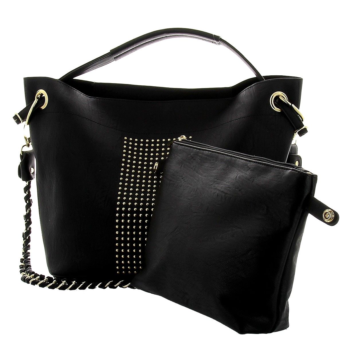 Женская сумка DISPACCI черного цвета. Выполнена из качественной эко кожи. Сумки с клепками сейчас на пике популярности! Очень стильная модель сумочки порадует как молодежь, так и взрослых! Идеальный вариант для тех кто следит за модой! Прекрасно подойдет, к классическому и повседневному образу. Цвет фурнитуры - золото. Сумка закрывается на общую металлическую молнию, имеет одно главное отделение. На дне имеются ножки. В комплекте прилагается маленькая сумочка, которая имеет боковой карман на молнии с внешней стороны, а внутри карман на молнии и кармашки для мобильного телефона и мелочей. Модель имеет одну ручку. Высота ручки - 14 см. Прилагается наплечный ремень интересного дизайна - цепочка с переплетением кожи, длина ремня 70 см.